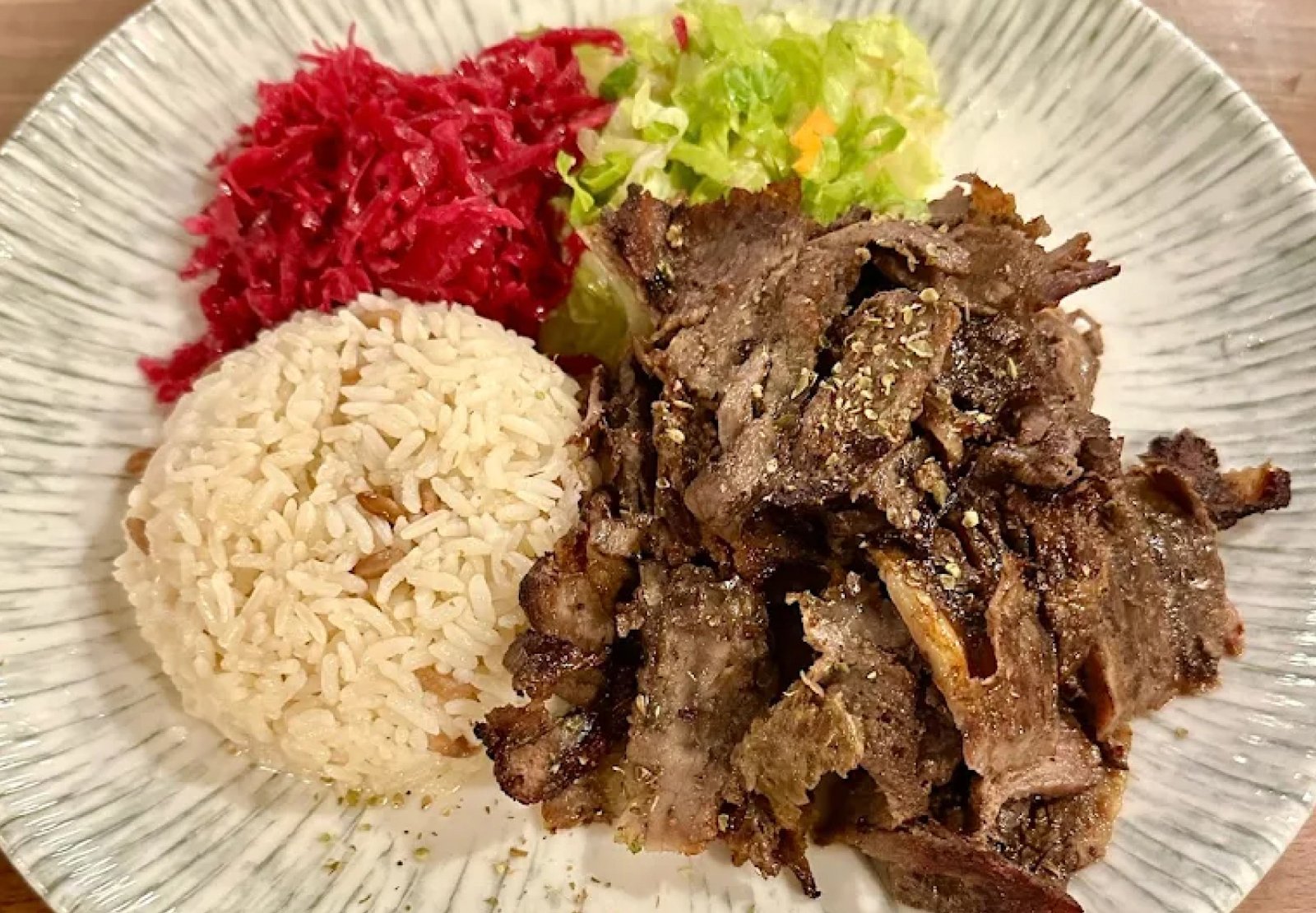 Grilled cubes of lamb, served with rice, grilled tomato, pepper, lettuce and red cabbage.