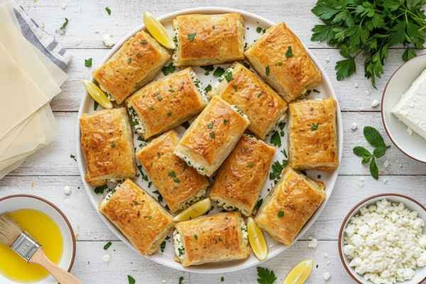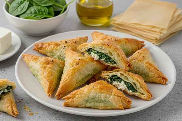 Phyllo dough stuffed with spinach and feta cheese.