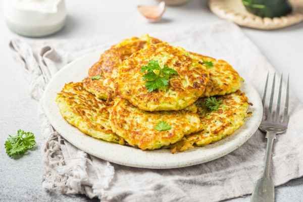 Pan fried zucchini pancakes, mixture of zucchini, dill, parsley, egg and flour.